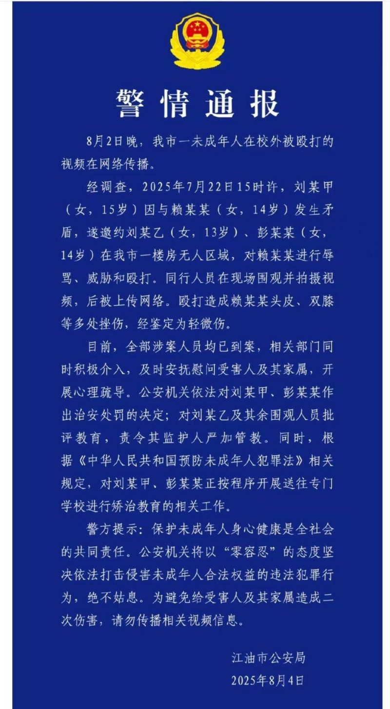 - 四川江油未成年女生在校外被殴打 警方通报:打人者为未成年,已治安处罚并启动送专门学校矫治程序