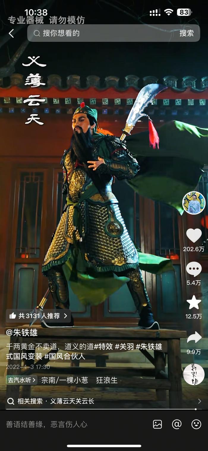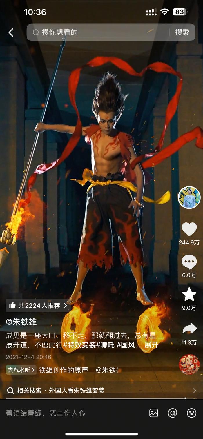 2021年8月,朱铁雄在抖音账号“朱铁雄”上发布了第一条国风变装视频——《齐天大圣》。4年来,这个账号制作发布的每一条视频都讲述了燃动人心的“中国超级英雄”故事,收获超2.1亿次点赞,评论区留下了众多网友的感动与共鸣。
