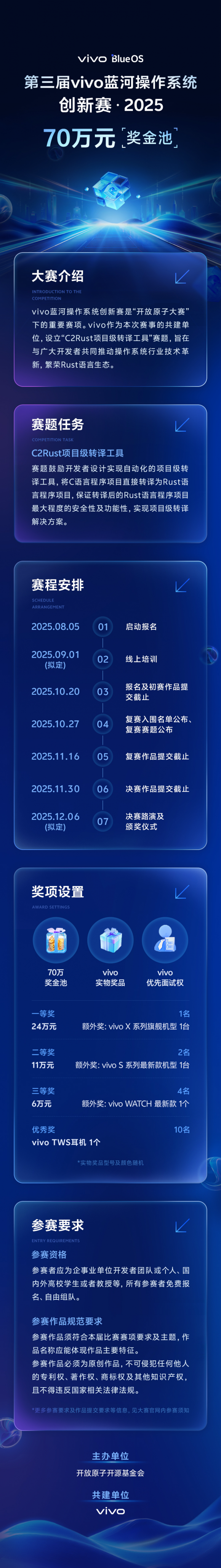 作为大赛的一个重要赛项,vivo蓝河操作系统创新赛(以下简称“蓝河创新赛”)于8月5日开启招募。本届大赛基于蓝河操作系统的Rust重点技术方向,围绕 C 语言与 Rust 语言的项目级转译设置赛题,资金池高达 70 万元。vivo致力于把蓝河操作系统创新赛打造为行业内最具含金量和影响力的Rust赛事,为Rust生态的建设与人才培养搭建高质量交流平台。