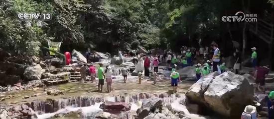 走进张家界大峡谷景区,青山峡谷间,溪流潺潺流淌,水质清澈见底。不少游客带着孩子来到这里,在清凉的溪水中尽情嬉戏,享受这份独有的凉爽。