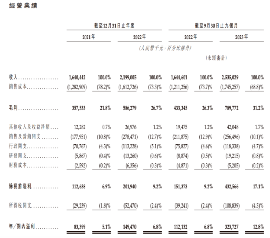 此外,根据灼识咨询,以全系统门店数目计算,沪上阿姨在中国五大现制茶饮店品牌中增长最快。招股书显示,2023年前九个月,沪上阿姨全系统门店数增加1990间,增幅达37.5%。