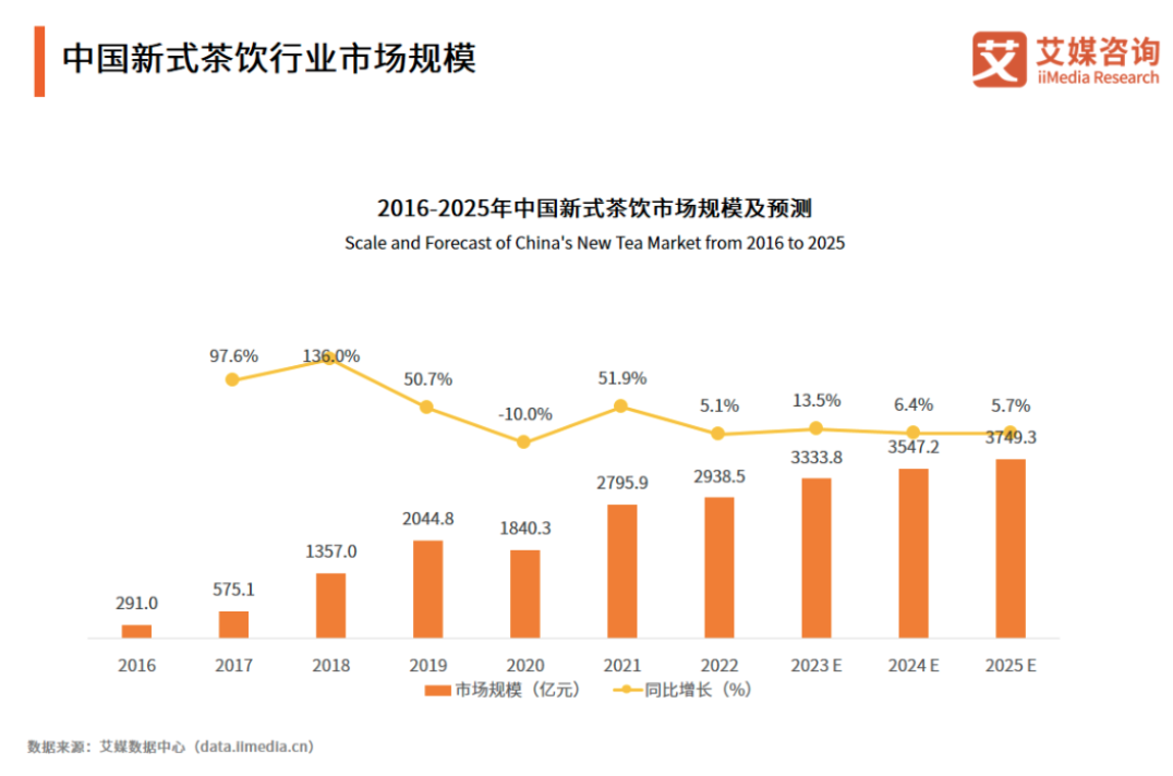 根据艾媒咨询数据显示,2022年我国新茶饮市场规模为2938.5亿,预计到2025年这一数字将会变成3749.3亿。不过需要注意的是,增速正变得肉眼可见的下滑,未来两年市场规模同比增长只有6%左右,这也预示着整个新茶饮赛道已经开始从曾经的增量市场转变为存量市场。
